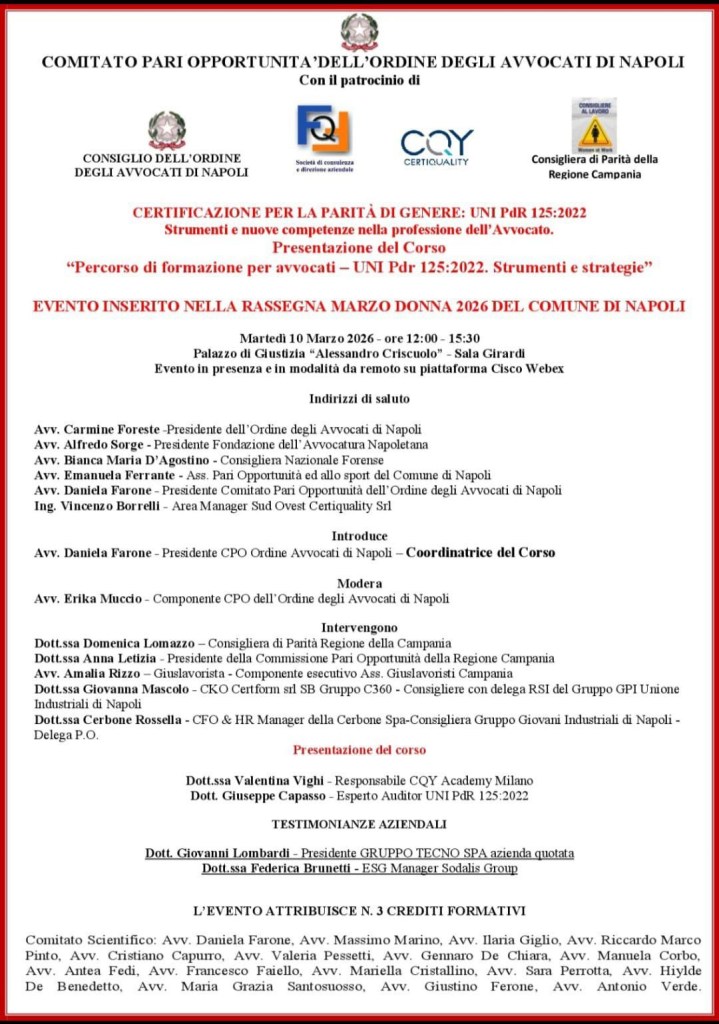 Il tema sarà al centro del convegno promosso dal Comitato Pari Opportunità dell’Ordine degli Avvocati di Napoli, in programma martedì 10 marzo 2026, dalle ore 12 alle 15.30, presso il Palazzo di Giustizia “Alessandro Criscuolo” – Sala Girardi, dedicato alla presentazione del percorso formativo “Certificazione per la parità di genere – UNI/PdR 125:2022. Strumenti e strategie”.