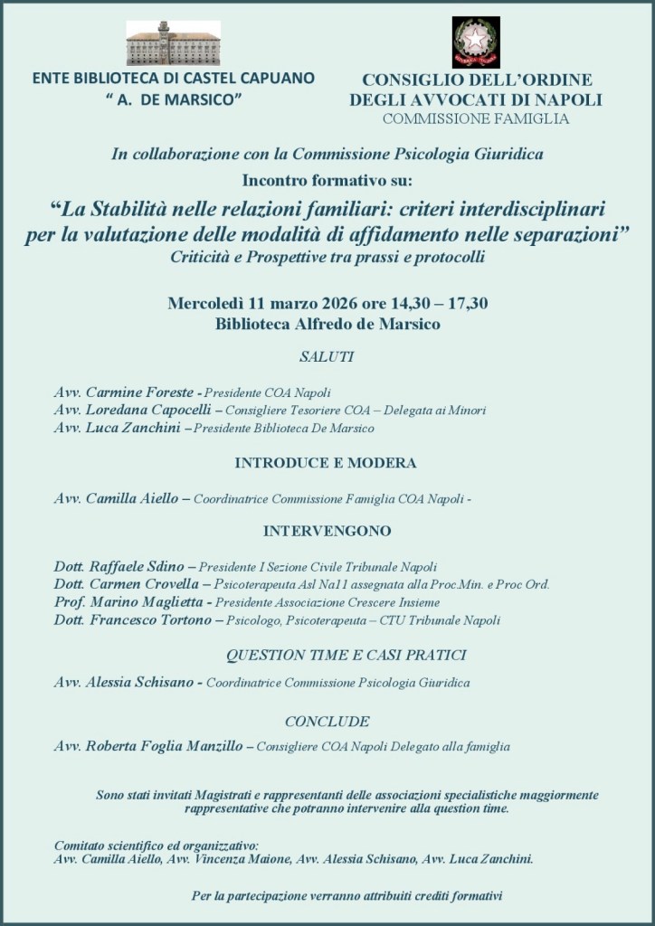 NAPOLI. Sarà dedicato alla stabilità delle relazioni familiari e alla tutela dei figli nei procedimenti di separazione l’incontro di studio in programma mercoledì 11 marzo 2026, dalle ore 14.30 alle 17.30, presso la Biblioteca “Alfredo De Marsico” di Castel Capuano. L’iniziativa, promossa nell’ambito delle attività dell’Ordine degli Avvocati di Napoli, intende aprire un confronto tra operatori del diritto e professionisti delle scienze psicologiche sui criteri di valutazione dell’affidamento dei minori e sulle criticità che emergono nella pratica giudiziaria.